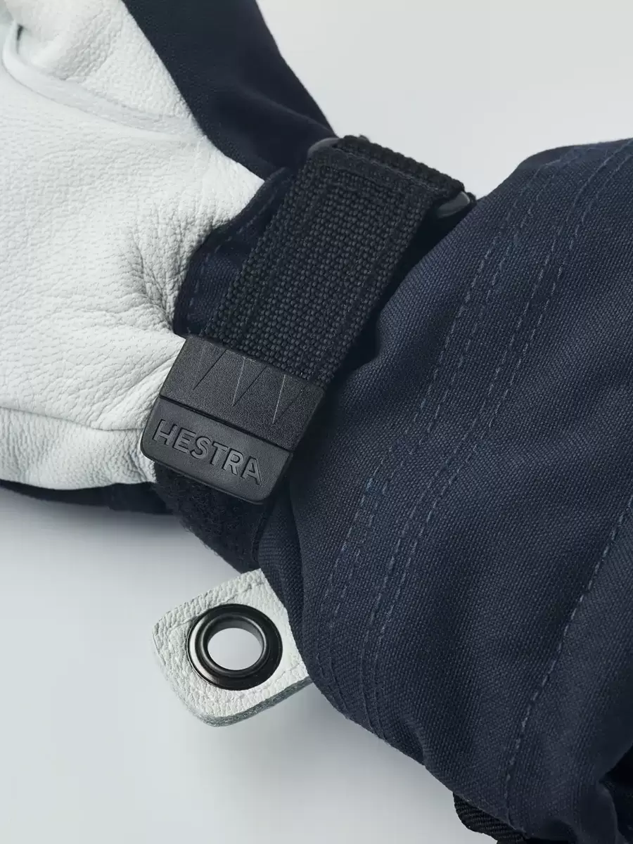 Hestras Heli Ski-handske blev oprindeligt skabt til canadiske skipiders, der havde brug for en pålidelig, varm skihandske til lange dage med sne og kulde. Hvad kunne være bedre for skiglade juniorer, der skal ud i skoven, på pisterne eller i parken, så snart de har et ledigt minut? Ligesom voksenversionen er børnehandsken syet i slidstærkt gedeskind og vejrbestandig 3-lags polyamid. Fleeceforet er aftageligt og har varmende G-loft syntetisk isolering. En håndledsrem reducerer risikoen for at miste en handske, når du tager den af ​​på en lift for at bruge en telefon eller justere skibrillerne. Der er også et øje og en fingerløkke til at hænge handsken op. En slidstærk, varmende vinterledsager i alle slags skiterræn hele sæsonen. Fås også som vante og i en trefingerversion.
