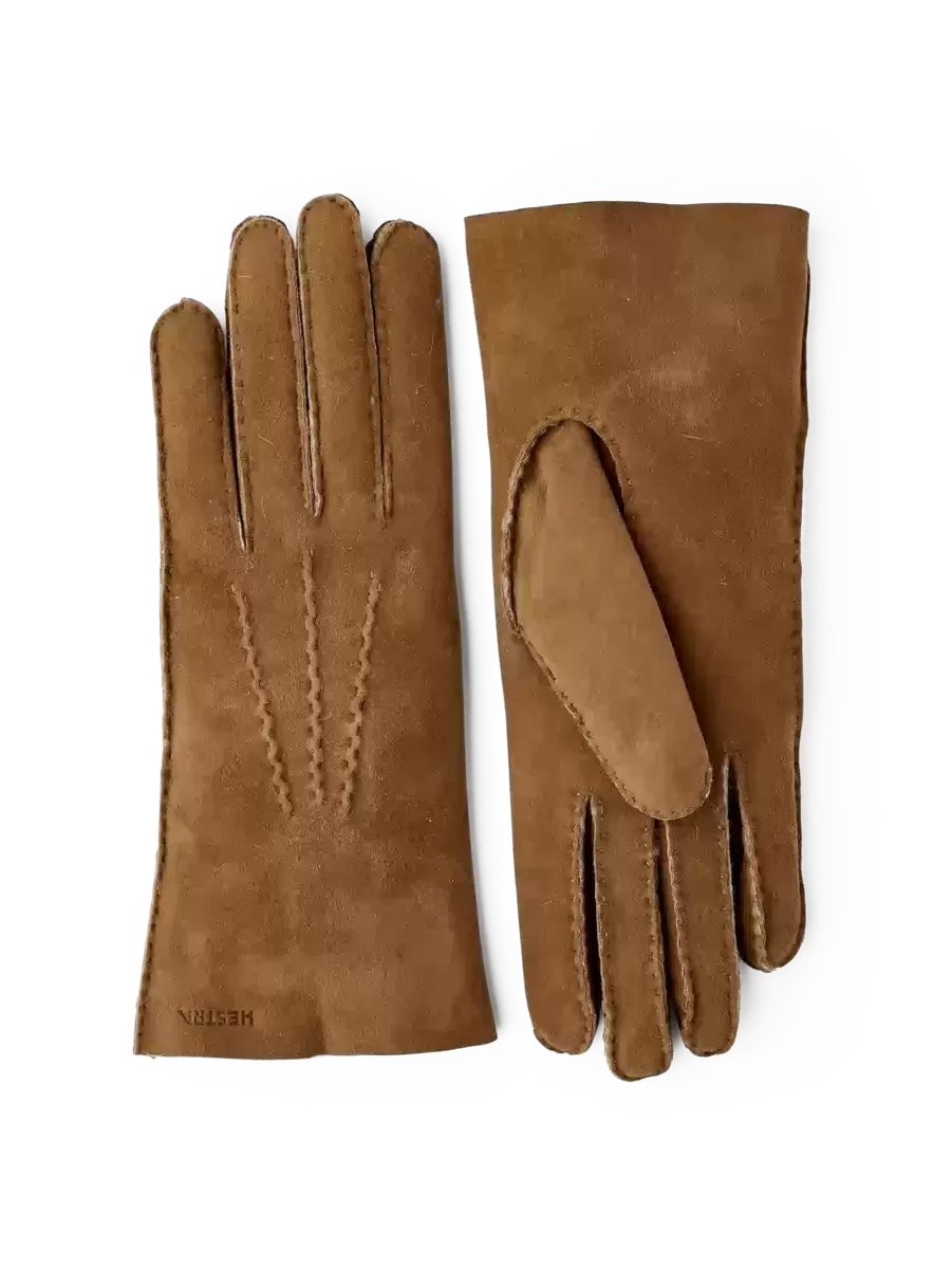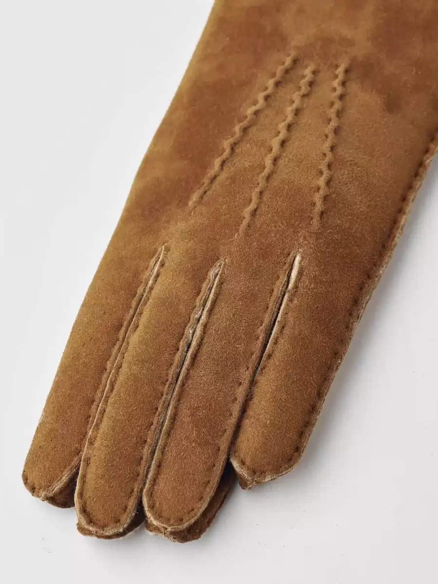 En blød, let damehandske i lammeskind, der giver behagelig varme på de koldeste vinterdage. Et tidløst design, der er syet helt i hånden med ruskindssiden vendt udad, mens det luftige lammeskind omslutter hånden i varme. Et smukt og varmende modetilbehør, der fungerer lige så godt til vinterture på landet som til dage i byen.