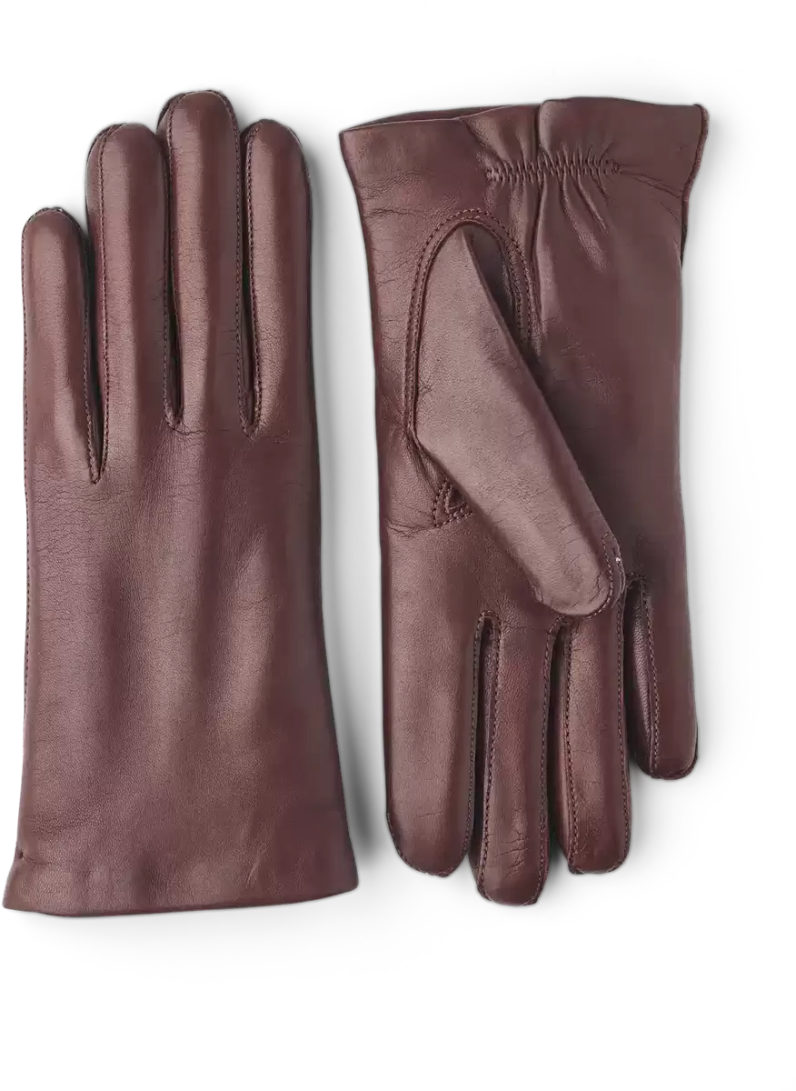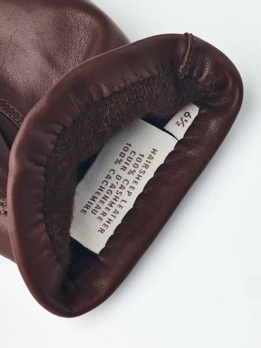 En kort damehandske med et sofistikeret, strømlinet design, syet i italiensk fåreskind med et strikket for i den blødeste kashmir. Handsken er håndskåret af handskeskærere i Hestras værksted i Ungarn, og håndværket er mesterligt med piqué-sømme på baghånden og håndfladen. Handsken sidder tæt, og kashmirforet er dejligt varmt på kolde dage om efteråret og vinteren.