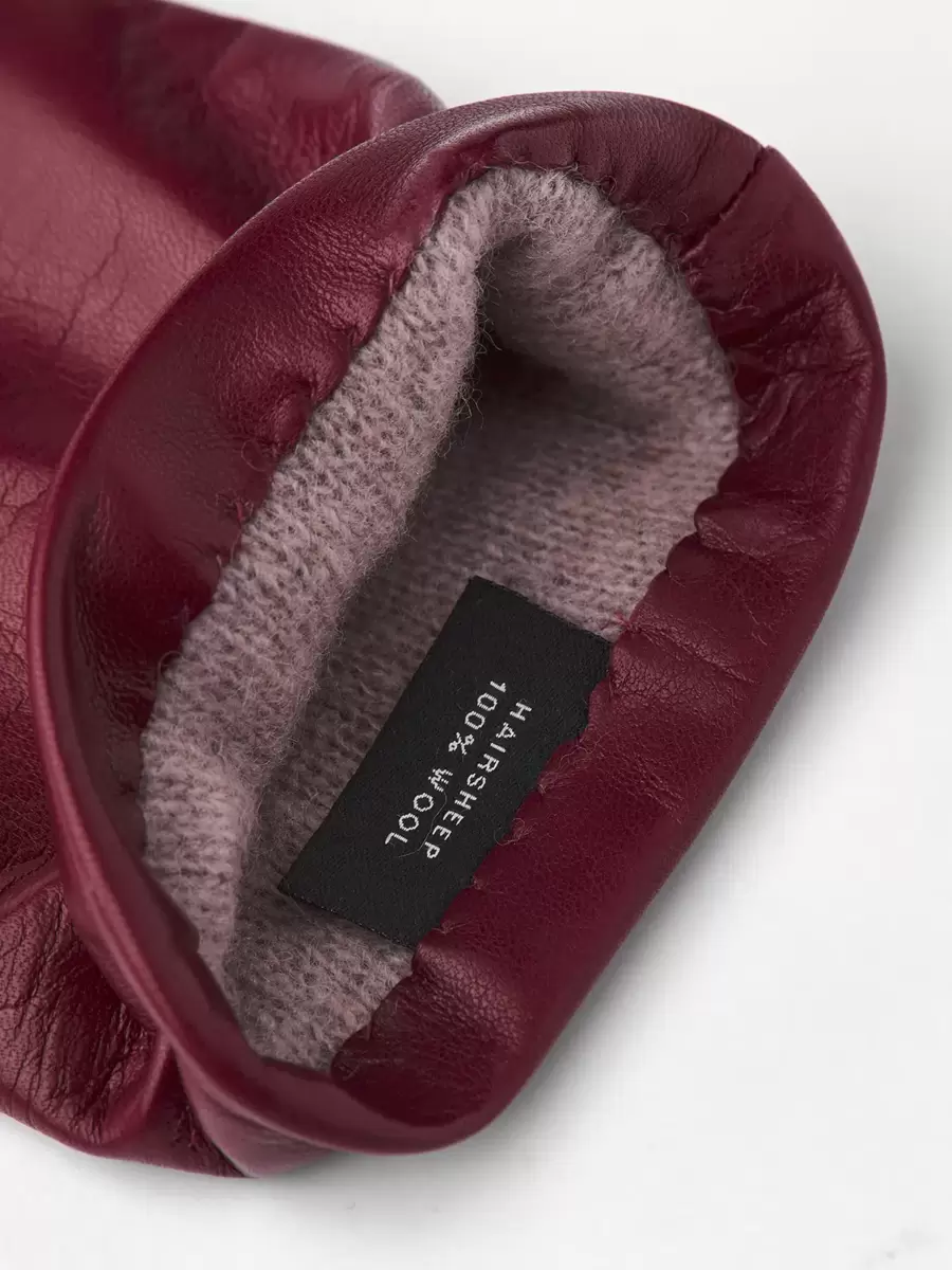 En elegant og tidløs læderhandske med et blødt, strikket uldfor. Syet i smidig italiensk lamme-nappa med håndsyede dekorative syninger på bagsiden af ​​hånden. Pasformen er feminin og tæt til hånden med halve piqué-sømme omkring fingrene. Et tidløst og smukt modetilbehør, der er perfekt varmende i forår og efterår samt på milde vinterdage.