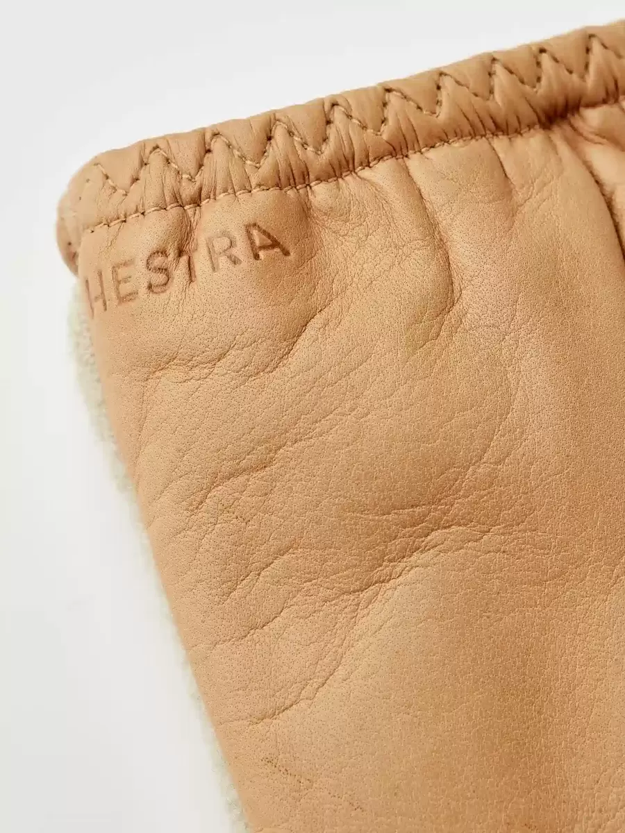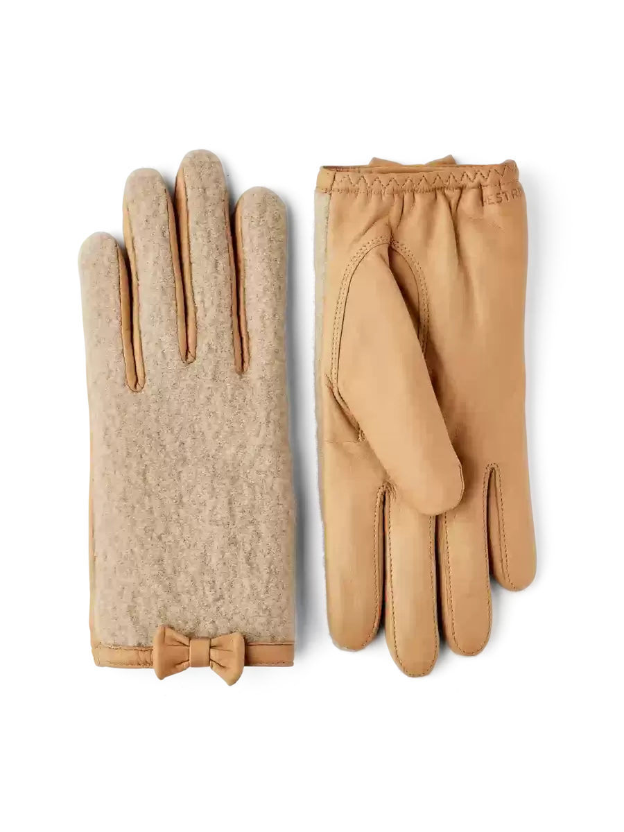 Pasformen er tæt på hånden med et tyndt strikket uld-/polyamidfor. Fint udførte detaljer inkluderer piqué-syning langs fingrene, læderkant og en lille sløjfe på ydersiden af ​​håndleddet. Et tidløst modetilbehør til hverdagsbrug og særlige lejligheder.