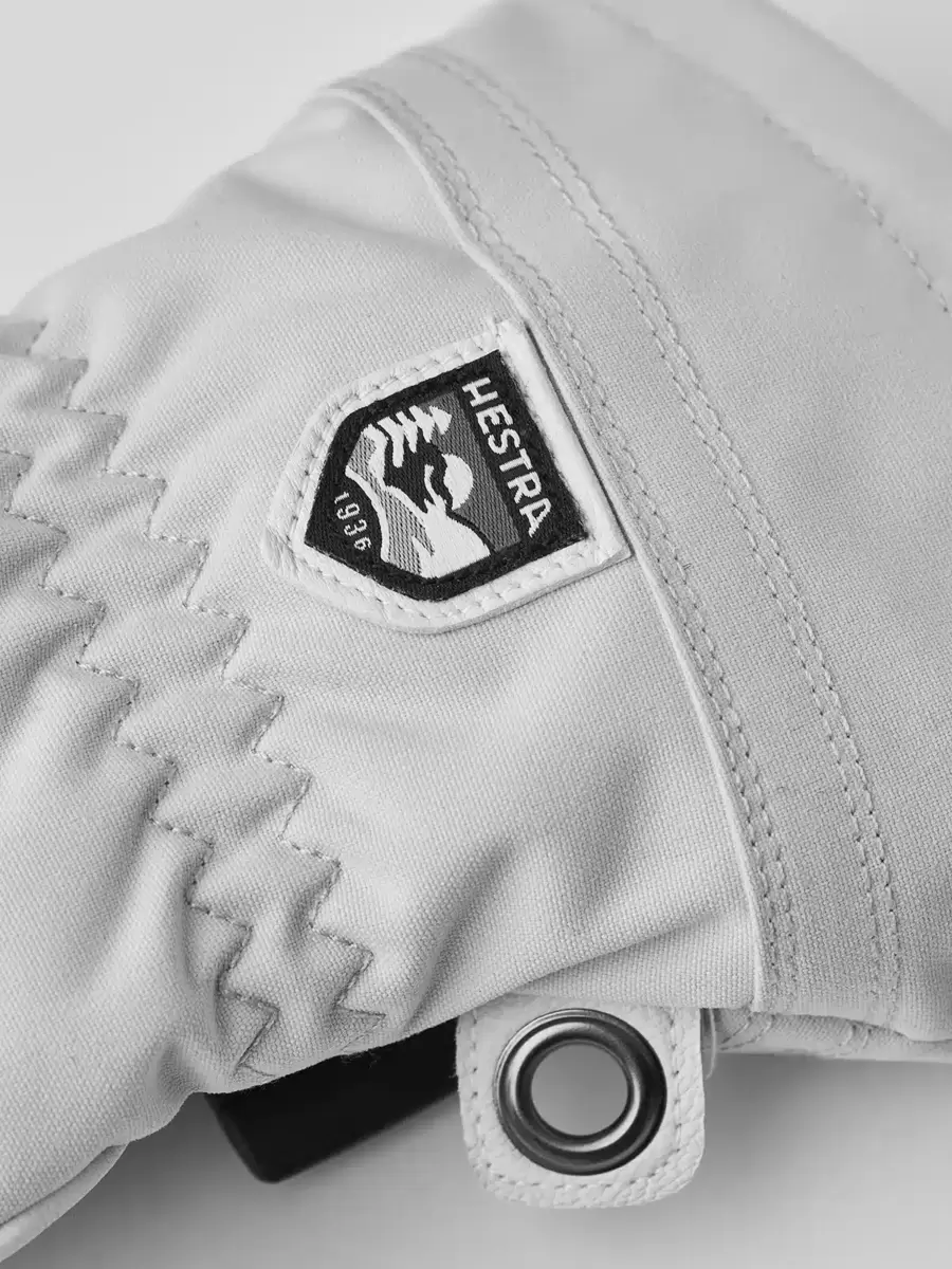 Hestras Army Leather Heli Ski blev oprindeligt skabt til skipiders i det vestlige Canada, der havde brug for en pålidelig og varm skihandske til lange, kolde dage i sneen. Denne 3-finger handske til kvinder har et smallere snit, der passer til kvinders smallere hænder, men er syet i den samme slidstærke, vejrbestandige kombination af gedeskind og 3-lags polyamidstof som herreversionen. Ligesom alle 3-finger versioner tilbyder den noget mere varme, samtidig med at den bevarer en vis fingerfærdighed. En række smarte funktioner er praktiske, når du ikke kan gå indendørs for at varme dig op så ofte. For eksempel er foret nemt at fjerne og tørre eller udskifte med en tyndere inderhandske, når du er mere aktiv og vandrer op ad bakke. I puddersne holder den lange manchet med snelås og håndledsjustering sneen på ydersiden og varmen på indersiden. En håndledsrem reducerer risikoen for at tabe en handske, hvis du tager den af ​​for at justere dit udstyr eller bruge din telefon. Og den medfølgende karabinhage betyder, at du kan hænge handsken op med åbningen nedad – praktisk for at undgå, at dine handsker fyldes med sne, mens du kun har et tyndere for på. En slidstærk og fleksibel ledsager til skiløbere, der bruger meget tid udendørs, og som ofte befinder sig langt fra skisportsstedet og dets komfort. Fås også som vante- og 5-fingermodel og i en herreversion.