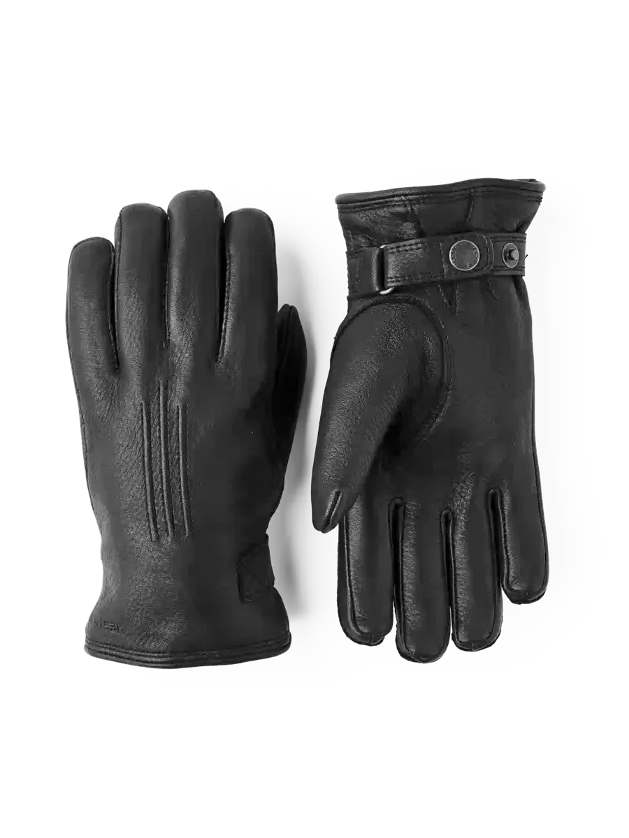 Det klassiske design har halve piqué-sømme på fingrene og klassiske syninger på bagsiden af håndleddet. En læderrem med trykknap justerer bredden rundt om håndleddet.