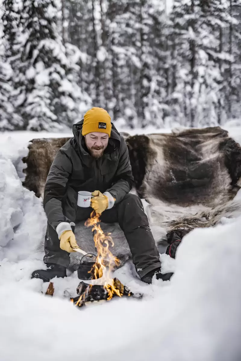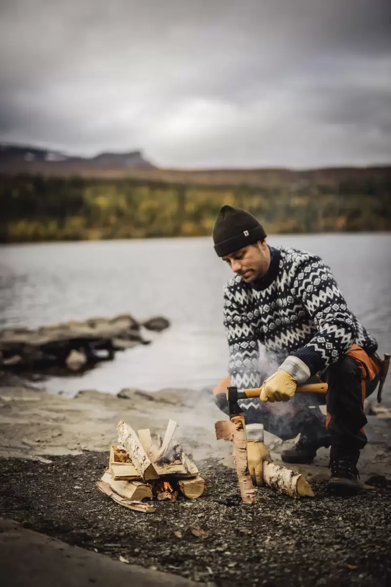 Høvle brænde, slå lejr op, bære ting – med Skullman-handsken er du klar til alt. Denne slidstærke, uforede læderhandske er udviklet i samarbejde med friluftseksperten Johan Skullman. En friluftsfavorit, syet i behandlet gedeskind overalt for at beskytte hånden, når du arbejder i skoven eller udendørs, med en lang manchet, der gør den nem at tage af og på. Manchetten har en lædertrækflig med et hul til at hænge handsken op til tørre. Der er også en øje på ringfingeren til at hænge handsken op med åbningen nedad for at undgå, at regn og sne trænger ind. Perfekt til vandreture, jagt, fiskeri og andre udendørseventyr.