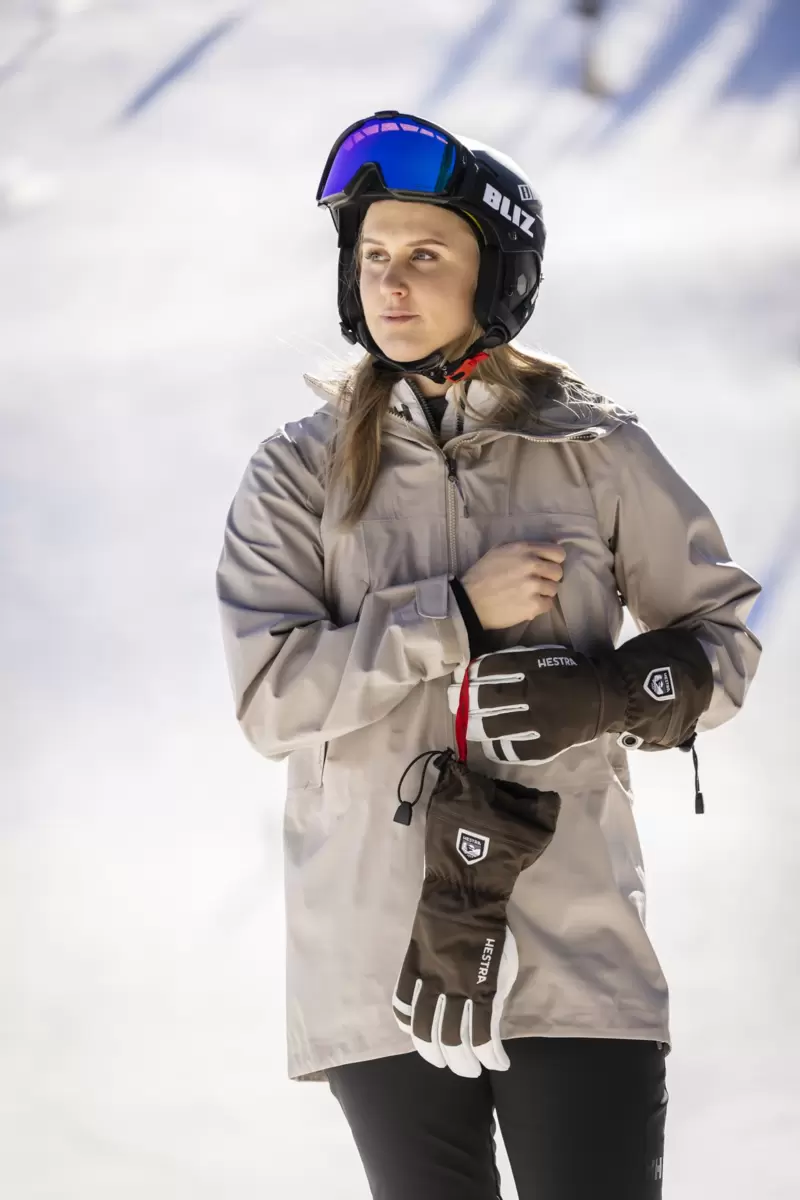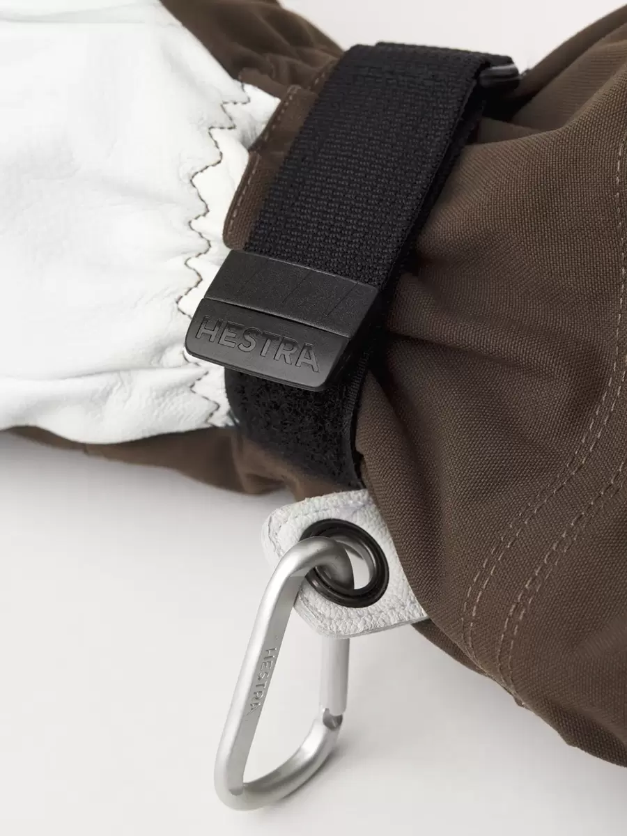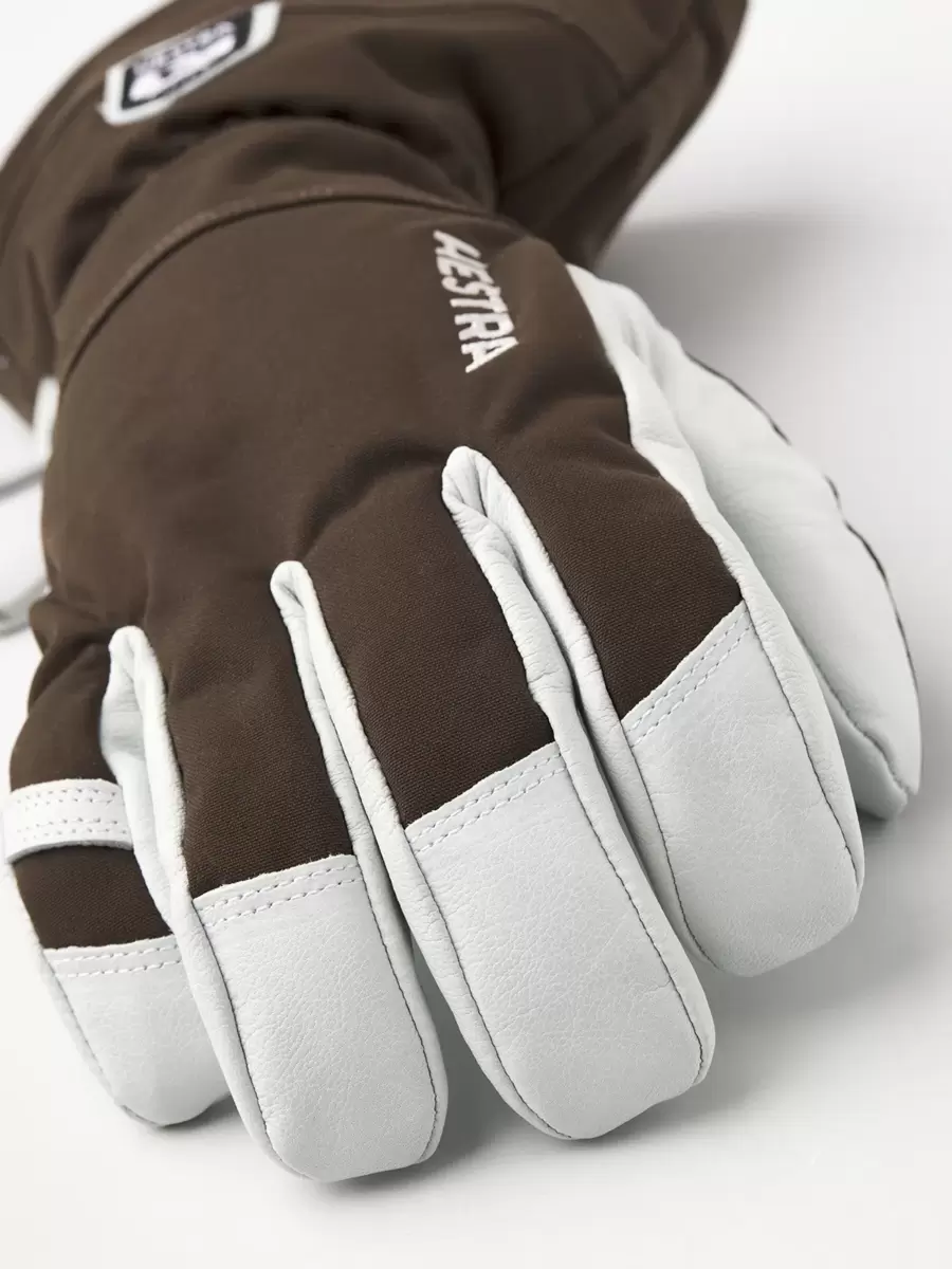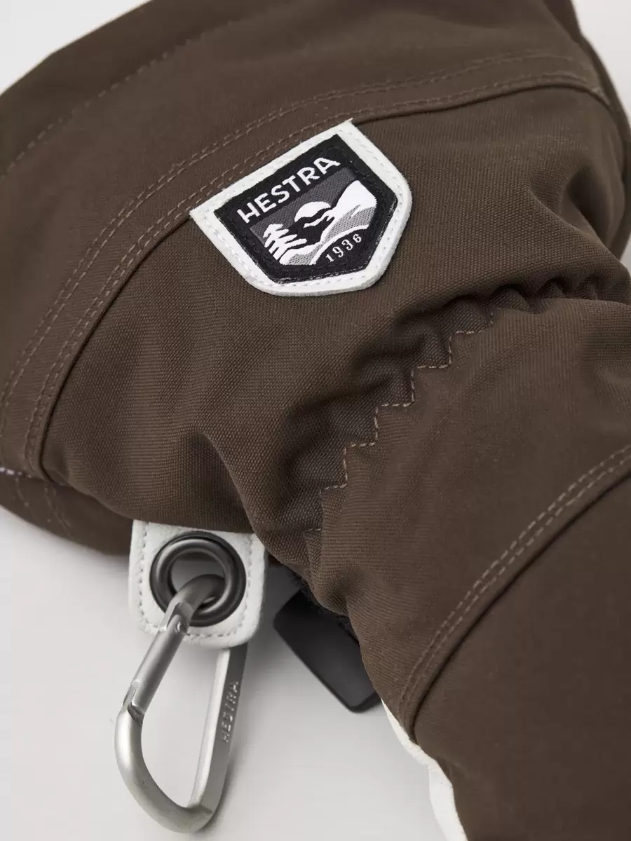 Hestras Army Leather Heli Ski blev oprindeligt skabt til skipiders i det vestlige Canada, der havde brug for en pålidelig og varm skihandske til lange dage med sne og kulde. Lavet af slidstærkt gedelæder, der giver et exceptionelt greb og en følelse, og en vandafvisende 3-lags polyamidstofbagside. Denne 5-fingre skihandske har en række smarte funktioner, der er praktiske, når du ikke kan komme i og varme dig op så ofte. Foret kan for eksempel nemt udskiftes, hvis det bliver fugtigt, eller for at tilpasse sig varierende aktivitetsniveauer og temperaturer. Og den lange krave har en snelås, der sammen med en velcrorem på håndleddet sikrer, at varmen forbliver inde i handsken. En håndledsrem reducerer risikoen for at tabe handsken, hvis du tager den af ​​for at besvare telefonen eller justere dit udstyr. En medfølgende karabinhage og et øje på lillefingeren gør det muligt at hænge handsken med åbningen nedad på dine skibukser eller klatresele – praktisk for at undgå, at den bliver fyldt med sne, mens du arbejder med kun et tyndere for på hænderne. En slidstærk og fleksibel ledsager til skiløbere, der bruger meget tid udendørs og ofte befinder sig langt fra skisportsstedet og dets komfort. Fås også som vante og 3-finger model.