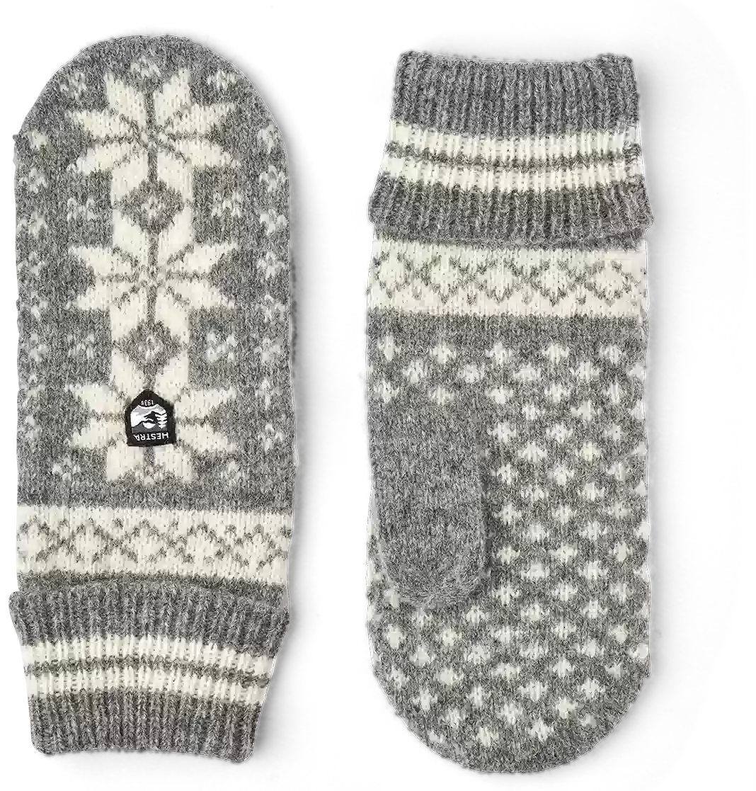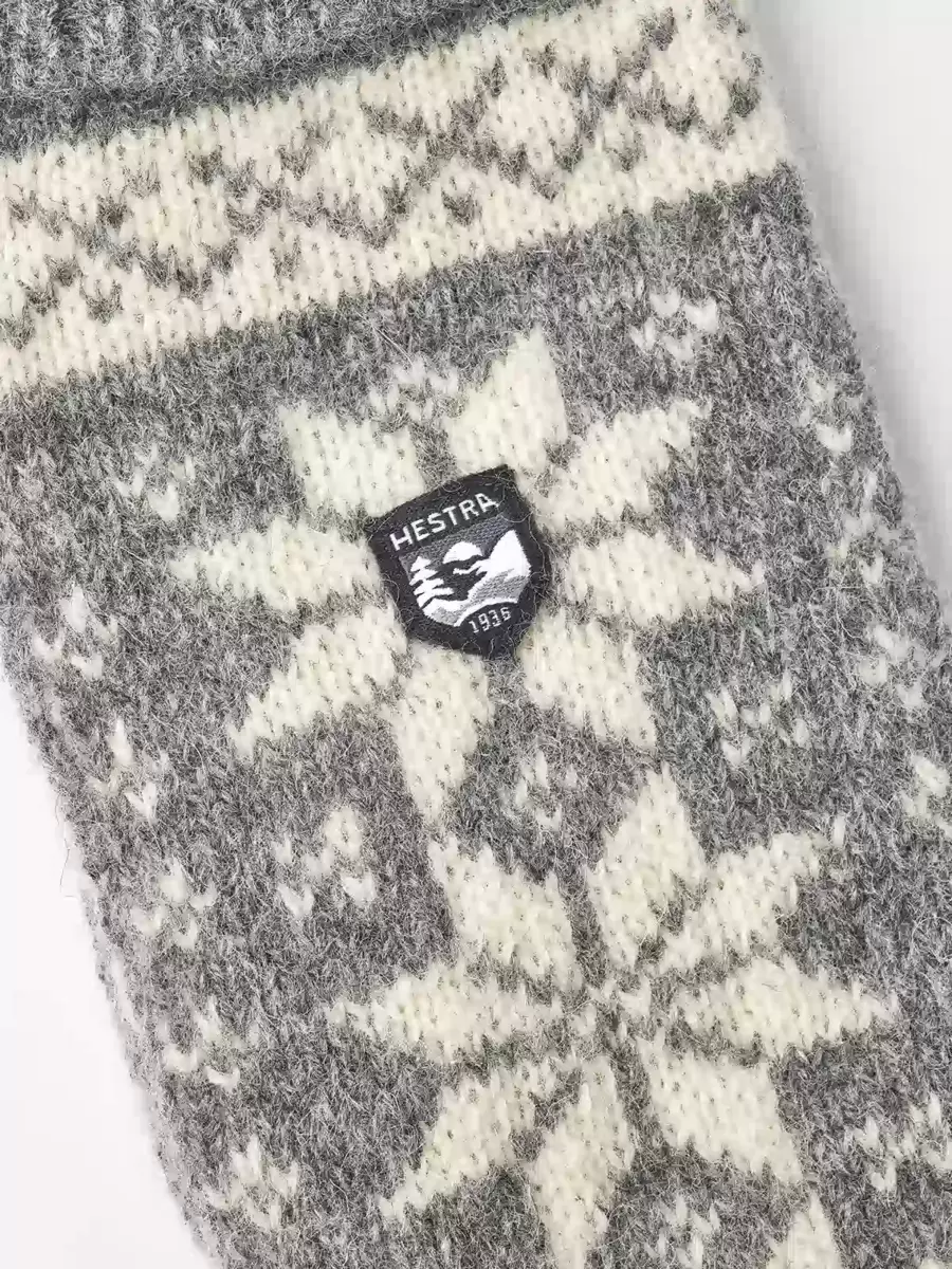 En klassisk strikket vante i uld. Strikket i et traditionelt nordisk Fair Isle-design i blødt, fint uldgarn blandet med lidt polyamid for ekstra styrke. Manchetten er ribbet, og der er et lille Hestra-logo på bagsiden af hånden. Et tidløst, smukt design, der holder hænderne varme på mildere efterårs- og vinterdage.