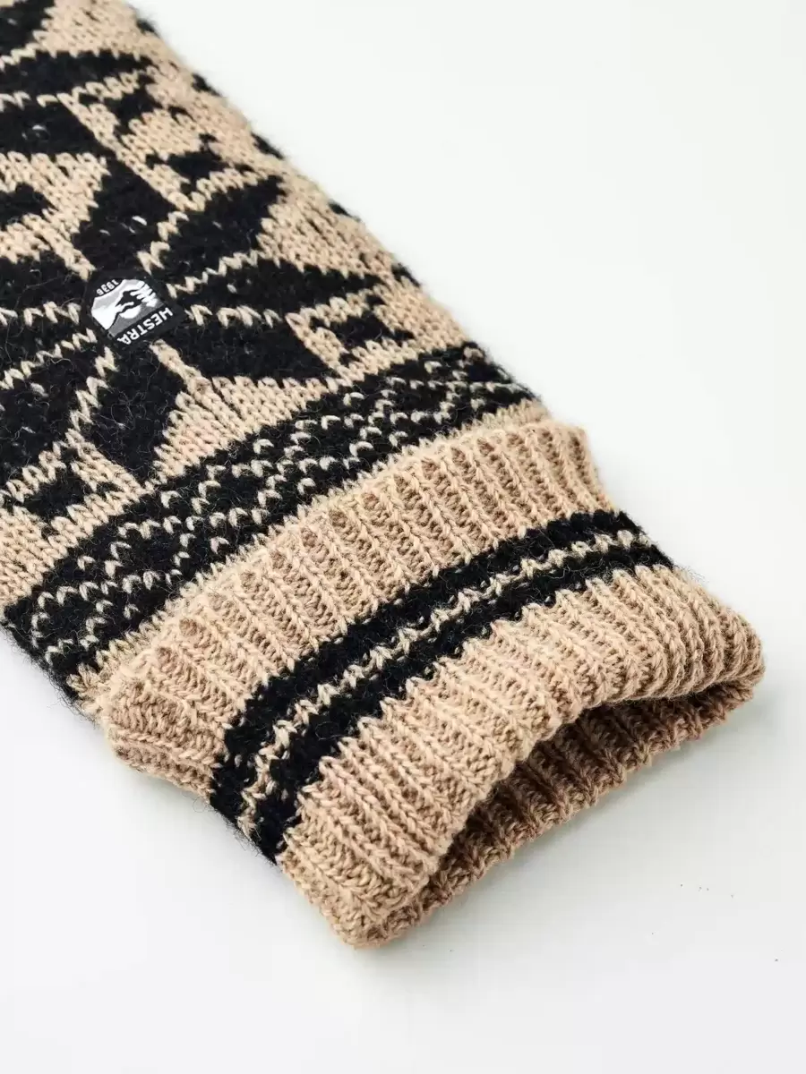 En klassisk strikket vante i uld. Strikket i et traditionelt nordisk Fair Isle-design i blødt, fint uldgarn blandet med lidt polyamid for ekstra styrke. Manchetten er ribbet, og der er et lille Hestra-logo på bagsiden af hånden. Et tidløst, smukt design, der holder hænderne varme på mildere efterårs- og vinterdage.